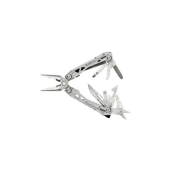 - Pince 11 outils : Pince à bec, Coupe fil, Couteau lame lisse, Couteau lame mixte, Scie, Ciseaux, Tournevis cruciforme, Tournevis plat (moyen), Tournevis plat (petit), Tournevis plat (large), Ouvre-boîte, Ouvre, Règle+ Décapsuleur, Lime