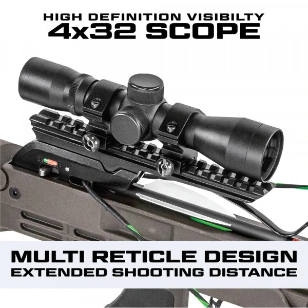 | Accessoires | Lunette 4×32, armeur manuel, carquois 3 traits, 3 traits HYPR avec pointe d’entraînement, lubrifiant pour rail. Ne comprend pas l’armeur mécanique qui peut être commandé séparément. |